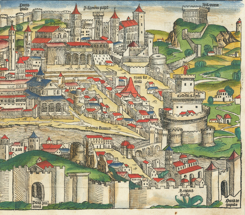 Hartmann Schedel (1440-1514) fue un médico, coleccionista de libros y escritor cuya obra más famosa, el Liber Chronicarum (Crónica de Nuremberg), incluyó algunas de las primeras vistas impresas de muchas ciudades de Europa y de todo el mundo. Schedel nació y murió en Nuremberg, pero también viajó por su educación. De 1456 a 1463 vivió en Leipzig, donde asistió a la Universidad de Leipzig y obtuvo su maestría. De allí fue a Padua, donde se doctoró en Medicina en 1466. Después de la universidad, trabajó durante un tiempo en Nördlingen y luego regresó a Nuremberg. En 1482 fue elegido miembro del Gran Consejo de Nuremberg.