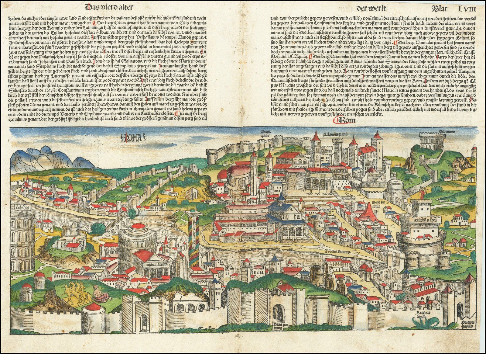 Si bien la mayoría de las ilustraciones del libro representan a los diversos santos, la realeza, la nobleza y el clérigo de la época, el trabajo es quizás más conocido por las vistas de gran formato de varias de las principales ciudades europeas, incluidas Roma, Venecia, París, Viena, Florencia, Génova, Saltzburg, Cracovia, Breslau, Budapest, Praga y las principales ciudades de Oriente Medio, incluidas Jerusalén, Alejandría y Constantinopla. La obra también incluía un magnífico mapa del mundo a doble página, un gran mapa de Europa y varias ilustraciones famosas, incluida la "Danza de la muerte" y escenas de la Creación y el Juicio Final. Si bien muchas de las vistas de la ciudad a doble página son ilustraciones poco precisas de las ciudades tal como existían a fines del siglo XV, las ilustraciones son de gran importancia en la historia iconográfica de cada una de las ciudades representadas. Algunas de las vistas de doble página aparentemente también se ofrecieron a la venta por separado, incluidas algunas que habían sido coloreadas antes de la venta.
