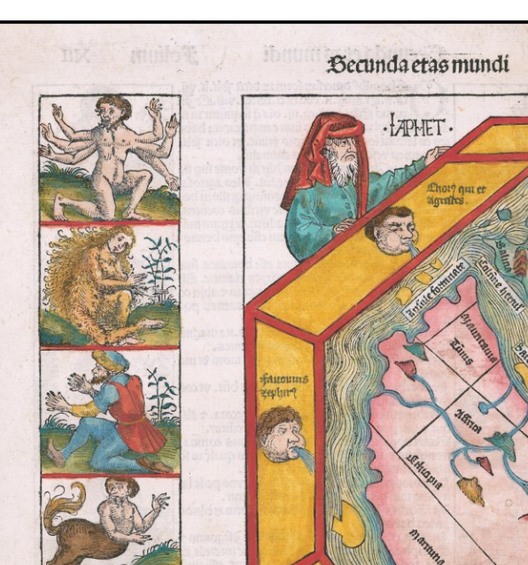 El mapa del mundo de Schedel se basa en Ptolomeo, omitiendo Escandinavia, el sur de África y el Lejano Oriente, y representa al Océano Índico sin salida al mar. La representación del mundo está rodeada por las figuras de Sem, Jafet y Cam, y los hijos de Noé, que repoblaron la Tierra después del Diluvio. A la izquierda, impresas de un bloque separado, hay imágenes de varias criaturas míticas, basadas en relatos de viajeros clásicos y medievales tempranos, incluido "un hombre de seis brazos, posiblemente basado en un archivo de bailarines hindúes tan alineados que aparece la figura delantera tener múltiples brazos; un hombre de seis dedos, un centauro, un hombre de cuatro ojos de una tribu costera en Etiopía; un hombre con cabeza de perro de las montañas Simien, un cíclope, uno de esos hombres cuyas cabezas crecen debajo de sus hombros, uno de los hombres con las piernas torcidas que viven en el desierto y se deslizan en lugar de caminar; un extraño hermafrodita, un hombre con un solo pie gigante (que Solinus afirma que se usa como sombrilla pero más probablemente un desafortunado enfermo de elefantiasis) un hombre con un enorme labio inferior (sin duda visto en África), un hombre con orejas colgando hasta la cintura y otras criaturas aterradoras y fantasiosas de un mundo más allá "(catálogo de Stanford Ruderman). El mapa mundial también incluye una gran isla frente a la costa occidental de África, que puede relacionarse con el relato del viaje de Martin Behaim a la región, a la que Schedel hace referencia en el texto.