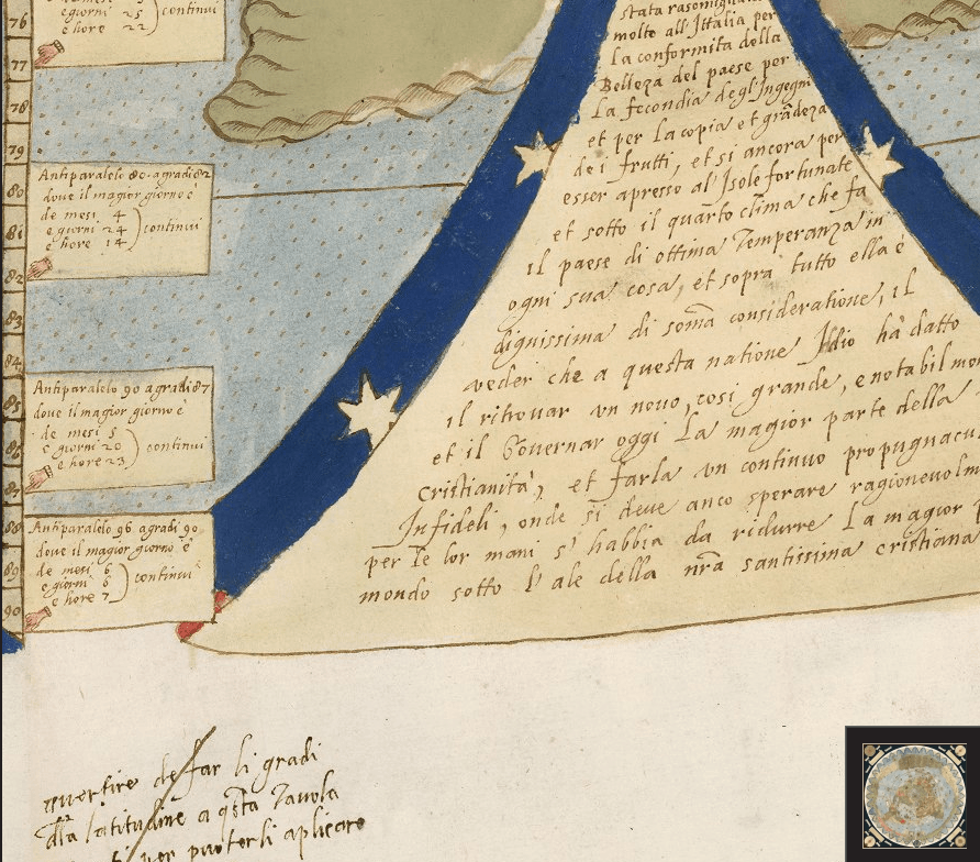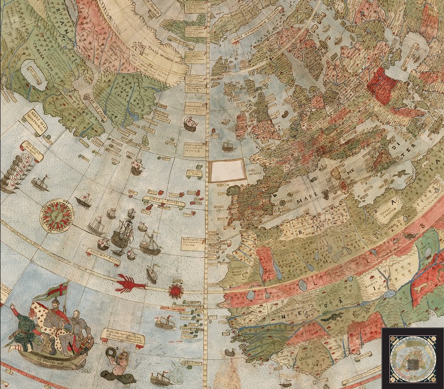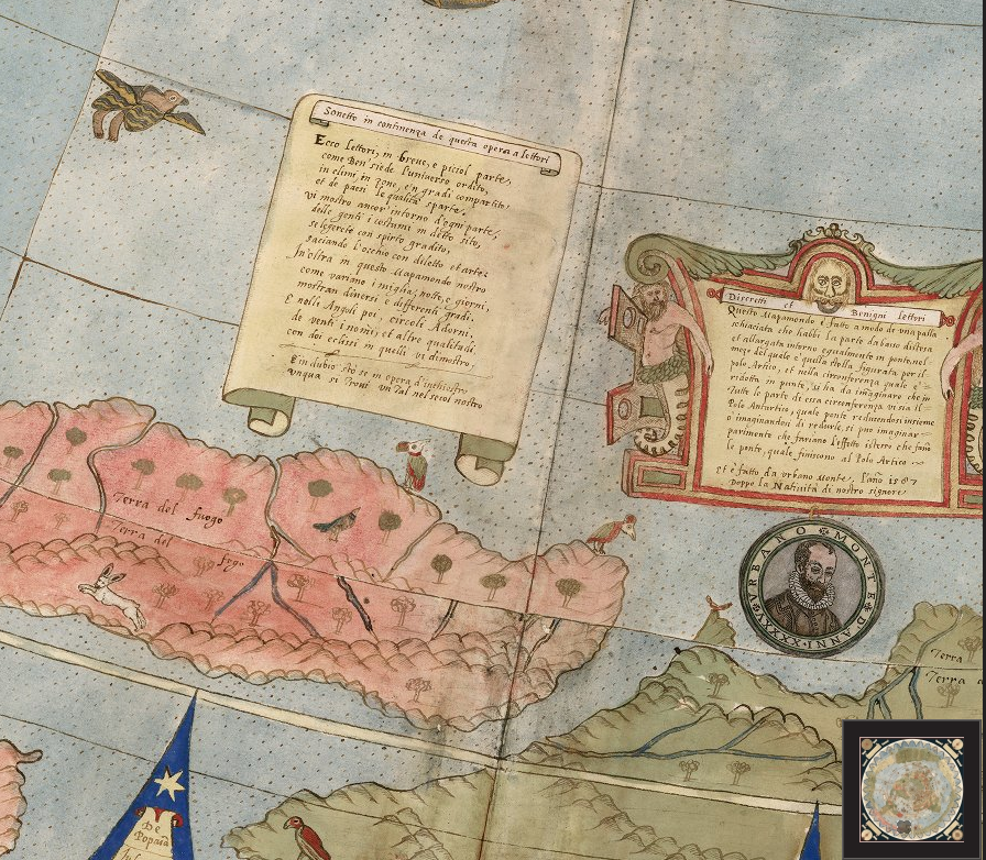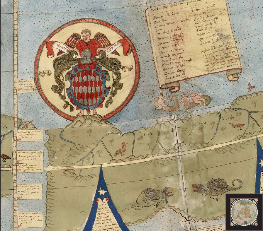 Un extraordinario mapa del mundo manuscrito en 60 hojas realizado en 1587 por Urbano Monte. Con 10 pies cuadrados, este mapa o planisferio es el mapa temprano más grande conocido del mundo. Fue dibujado a mano por Monte en Milán, Italia, y solo existe otra copia manuscrita. La imagen de mapa de 60 hojas unidas digitalmente a continuación es la primera vez que el mapa que Monte hizo se ha visto como un mapa unificado, como lo pretendía Monte, en los 430 años desde que fue creado.