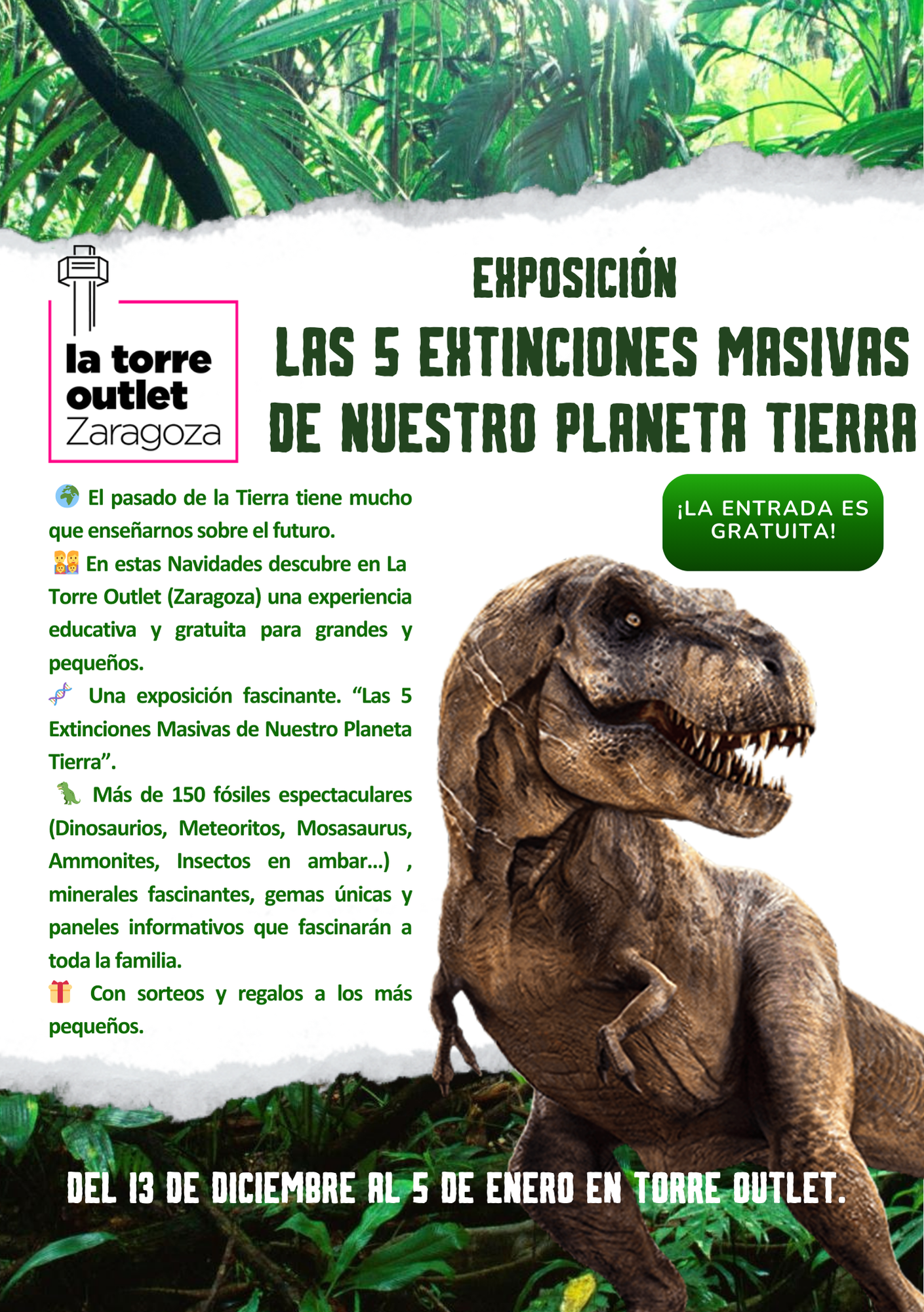 Este encuentro es también una oportunidad para complementar el aprendizaje con la exposición gratuita “Las 5 Extinciones Masivas de Nuestro Planeta Tierra”, que estará disponible paralelamente en La Torre Outlet Zaragoza (local 49). 🌟 Con una superficie de 180 m², esta muestra explora la historia geológica del planeta a través de eventos cíclicos como transgresiones y regresiones oceánicas, vulcanismo, impactos de asteroides y cambios climáticos. 🌋☄️❄️ La exposición incluye más de 150 piezas originales, entre las que destacan: